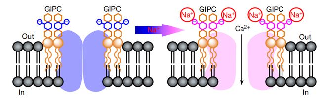 科研人员发现GIPC 可以结合细胞外盐离子,引起细胞表面电势变化,从而打开植物细胞质膜的钙离子通道,导致胞内钙离子浓度增加,进一步调节细胞生理生化活动以适应盐胁迫环境。植物特异的GIPC鞘脂是第一个被发现的植物盐受体,不同于动物的盐感受离子通道。
