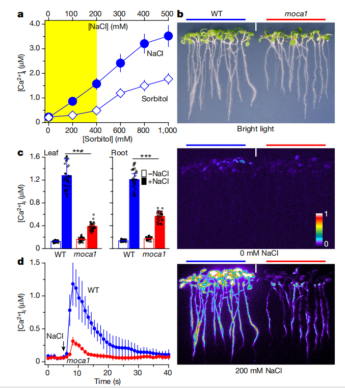 全世界约有20%的耕地受到盐害威胁,且逐年增加,导致粮食严重减产以及植物生态退化。我国盐渍土地面积约5.2亿多亩,盐碱化耕地达1.2亿多亩,因此,提高植物特别是农作物的抗盐性,有利于我国的粮食和生态安全。在过去的30多年里,人们一直在探寻植物感受逆境的感受器基因,包括盐受体。大量的电生理和药物学研究证明外界盐胁迫促使钙通过细胞质膜内流,导致细胞内钙增加。然而,导致细胞内钙离子增加的感受器基因及其作用机制始终不清楚。科研人员利用正向遗传筛选法获得了植物盐胁迫激活细胞内钙离子浓度增加的缺陷型突变体(moca1),发现MOCA1 可以将 GlcA(glucuronic acid)转移到 IPC(inositol phosphorylceramide),形成细胞质膜外侧的鞘脂 GIPC(Glycosyl inositol phosphorylceramide)。
