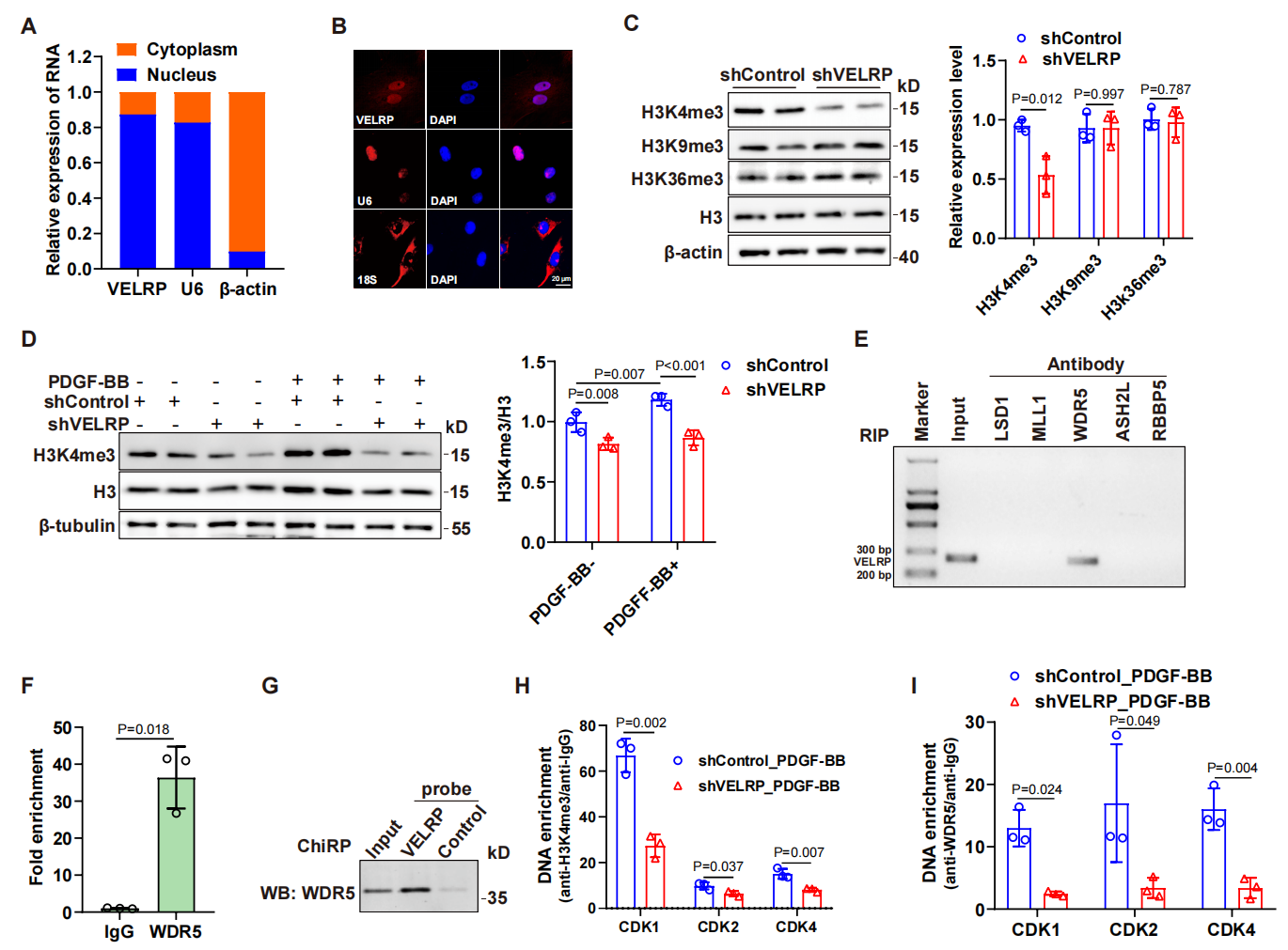 为了进一步揭示VELRP在PASMC增殖中的分子机制,研究团队进行了深入的机制研究。研究发现,VELRP主要定位于细胞核内,通过与WD重复蛋白5(WDR5)结合,促进了H3K4的三甲基化水平升高。组蛋白H3K4的三甲基化修饰是一种重要的表观遗传标记,与基因的活跃转录密切相关。H3K4的三甲基化水平升高进而增强了CDK1、CDK2和CDK4基因的转录活性。这些CDKs在细胞周期调控中发挥核心作用,其表达的增加直接促进了PASMCs的增殖。