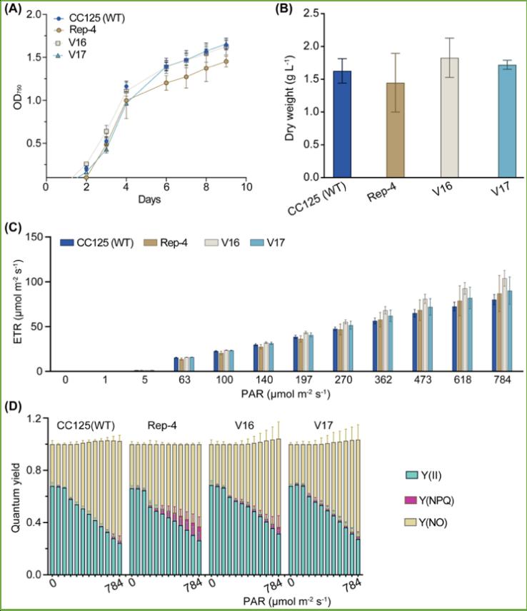 该研究进一步探究了病毒衍生的复制元件在莱茵衣藻中是否表现出毒性问题。研究发现病毒复制元件并未影响莱茵衣藻的生长、生物量积累和光合作用特性(图4),这表明病毒衍生的复制元件与作为宿主的莱茵衣藻细胞具有良好生物相容性。