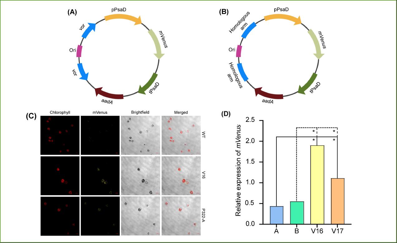 该研究通过在莱茵衣藻核基因组中表达Rep蛋白,构建了附加体遗传系统的底盘藻株,并利用mVenus荧光蛋白对该系统进行验证,实现了比传统莱茵衣藻叶绿体基因组同源重组方法更高效的外源基因表达水平(图2)。