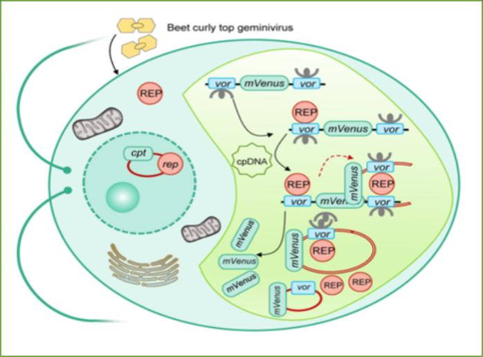 作为最具潜力的光合细胞工厂,目前莱茵衣藻叶绿体合成生物学平台受限于叶绿体基因组外源基因表达水平及同质化筛选的技术难题。为了解决这一瓶颈问题,本研究利用甜菜卷曲顶部病毒的复制元件Rep蛋白及(vor)序列,开发了一套莱茵衣藻叶绿体的附加体外源基因表达系统(图1)。