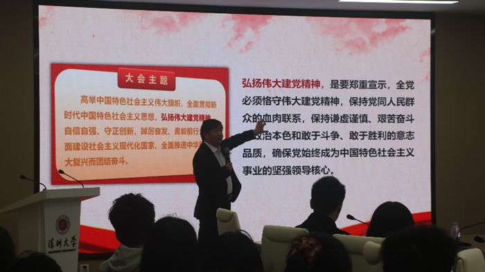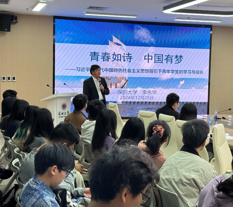 2024年12月25日,深圳大学副校长李永华在丽湖校区守慧楼501会议室为生命与海洋科学学院和材料学院师生代表讲授主题为《青春如诗,中国有梦》的专题党课。生命与海洋科学学院党委书记梁杰、院长刘宏涛、党委副书记毛斐,材料学院党委副书记李小平,以及两个学院120名师生代表参加讲座。讲座由李小平副书记主持。