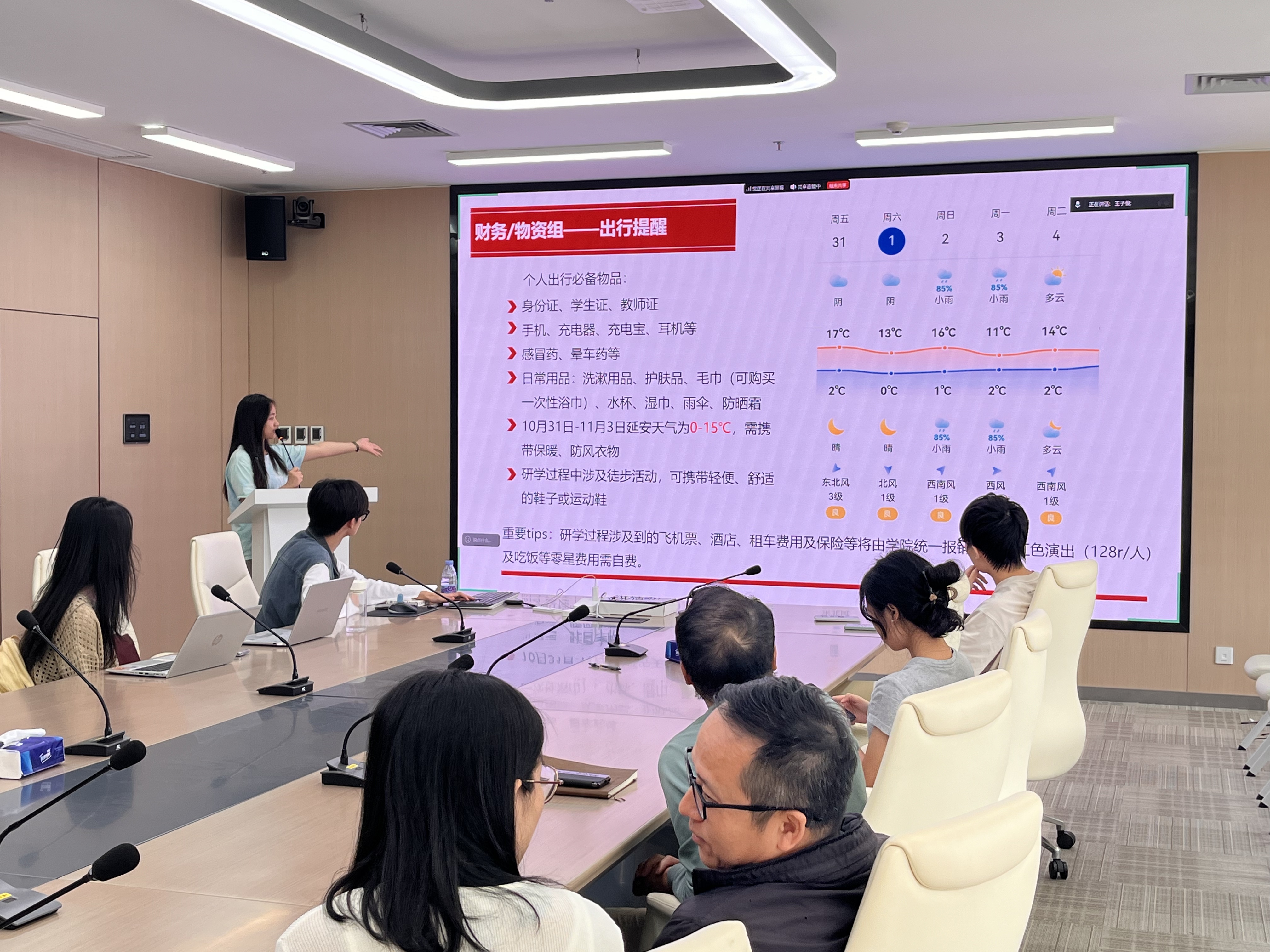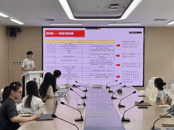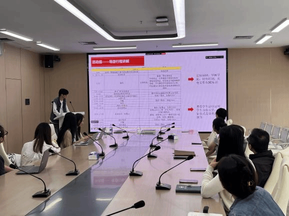 财务物资组龙秀荣同志汇报行前各项准备工作,并温馨提醒飞机值机等注意事项。活动组王子俊、黎藜和陈佳敏同志详细介绍研学期间的每日行程安排。宣传组张凤喜同志汇报宣传推文与视频的分工细节和任务要求。