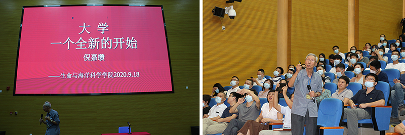 2020年9月18日上午,生命与海洋科学学院2020级新生师生见面会暨书记院长“思政第一课”在丽湖校区A5一楼报告厅举行,学院名誉院长倪嘉缵院士、院长胡章立教授、党委梁杰书记、毛斐副书记、副院长邓利教授、李辉教授及各系专任教师、管理技术岗教师出席了见面会。2020级178名本科生新生、75名研究生新生身着整齐的院服参加了会议,本次师生见面会由学工办黄冰婵老师主持。