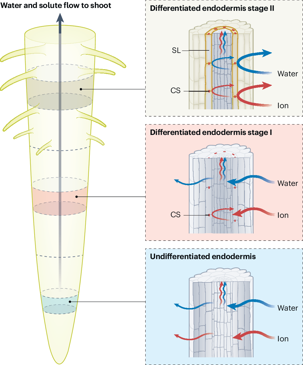 植物依靠根系固着在土壤中,根系是植物获取水分和矿质元素的最主要器官,也是植物适应复杂环境的重要节点。根系在适应环境的漫长过程中演化出了多种机制以实现对水分和养分的高效利用和精准调控,其中一项关键的结构创新是扩散屏障的出现,主要包括凯氏带(Casparian strip)以及木栓质片层(Suberin lamellae)。在全球气候变化的背景下,扩散屏障作为植物应对环境胁迫的关键结构,展现出愈加重要的生理功能,也受到越来越多的关注。