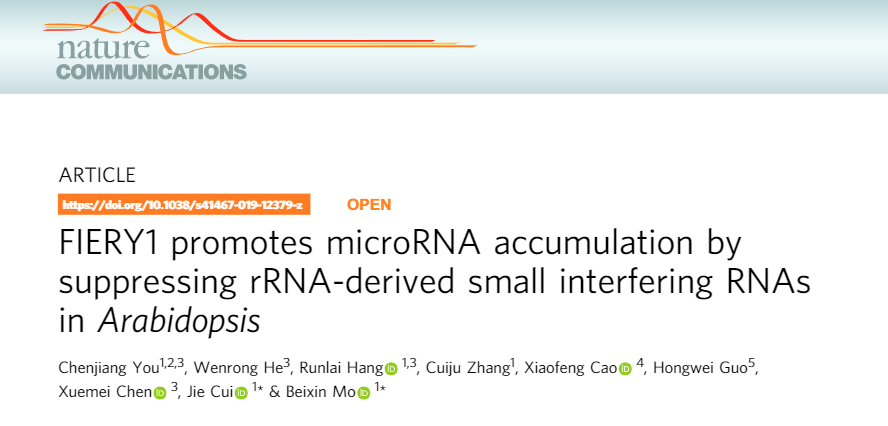 2019年9月27日,Nature Communication 在线发表了深圳大学生命与海洋科学学院莫蓓莘课题组研究论文,题为“FIERY1 promotes microRNA accumulation by suppre…