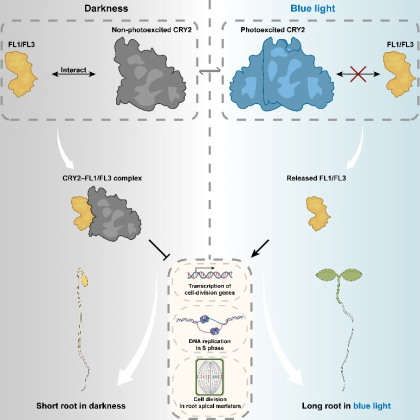 The research found that CRY2 regulates key processes such as cell division and photosynthesis in darkness by influencing the expression of related genes. Under dark conditions, CRY2 suppresses root elongation by inhibiting cell division in the root apical meristem. Interestingly, blue light alleviates this inhibition.The study also identified two proteins from the FORKED-LIKE (FL) family, FL1 and FL3, that bind to CRY2 in the dark, with this interaction being specifically suppressed by blue light. Further investigation revealed that FL proteins bind only to monomeric CRY2 in the dark, not to its polymerized form after blue light exposure. FL1 and FL3 are cell-division-promoting factors that facilitate root growth by promoting gene expression. In darkness, CRY2 inhibits FL proteins’activity, suppressing root elongation. Under blue light, CRY2 forms a polymer and releases FL proteins, promoting root growth. (Figure 1)