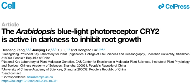 On November 15, 2024,Cellpublished a groundbreaking study from Professor Liu Hongtao’s lab at Shenzhen University titled“The Arabidopsis blue-light photoreceptor CRY2 is active in darkness to inhibit root growth.”This study challenges traditional research paradigms by revealing that CRY2 has a distinct function in the dark, demonstrating that blue light not only“activates”but also“inactivates”CRY2.