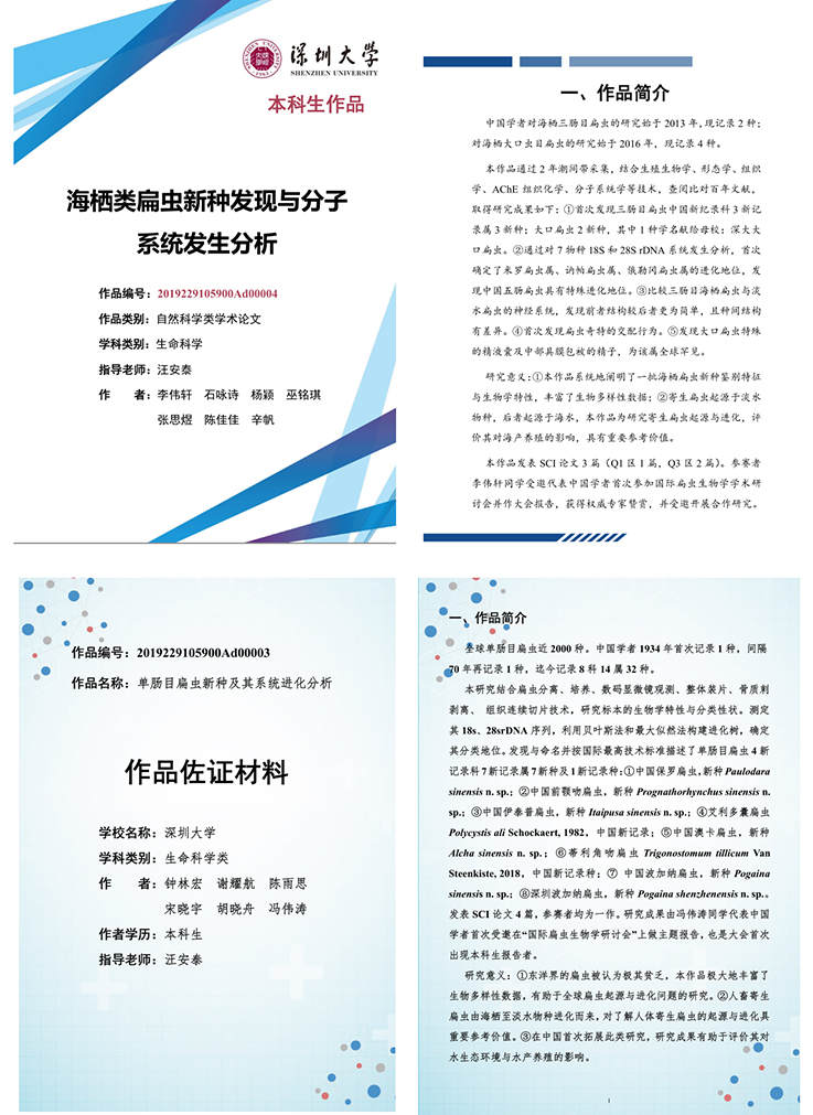 11月12日,由共青团中央、中国科协、教育部、中国社科院、全国学联和北京市政府主办,北京航空航天大学承办的第十六届“挑战杯”全国大学生课外学术科技作品竞赛终审决赛落下帷幕。本次竞赛评审委员会评出特等奖作品35件、一等奖作品105件、二等奖作品286件、三等奖作品786件。其中,深圳大学生命与海洋科学学院李伟轩同学以“海栖类扁虫新种发现与分子系统发生分析”斩获一等奖,该项目同时获得广东省唯一的一个累进创新奖(铜奖)。胡晓舟同学以“单肠目扁虫新种及其系统进化分析”斩获二等奖。
