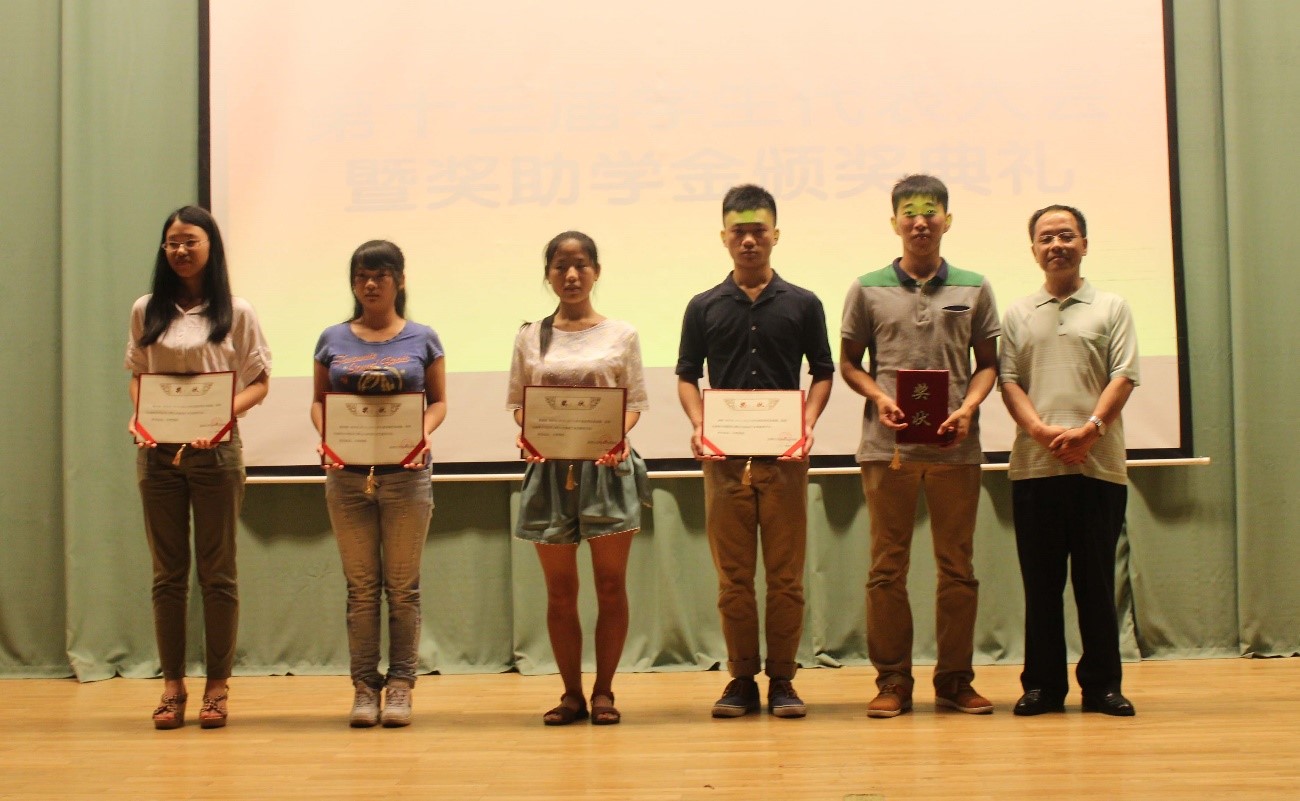 2014年6月19日晚19:00-21:00,生命科学学院第十三届学生代表大会暨学院奖助学金颁奖典礼在科技楼1号报告厅举行。学院院长胡章立教授、党委副书记梁杰老师、华之粹公司油茶产业发展奖学金设立单位深圳市华之粹生态科技有限公司范国城主任、曾琼女士,院团委书记黎科老师、辅导员张建华老师、各兄弟学院学生会主席以及全体学生代表出席了会议。
