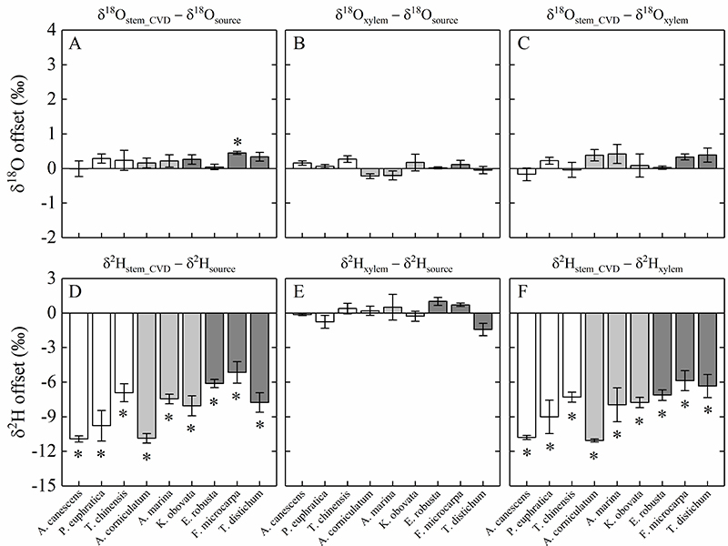 图 2不同生境来源木本植物茎干样品低温真空抽提水(stem_CVD)、土壤水(source)和蒸腾水汽(xylem)氢氧同位素值的比较。