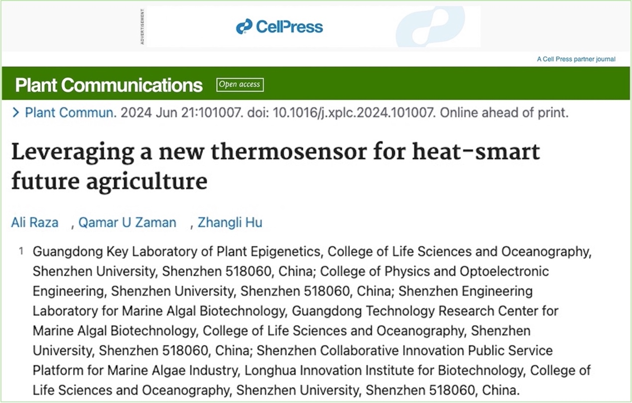 2024年6月21日,深圳大学生命与海洋科学学院胡章立教授团队在Cell Press合作伙伴期刊Plant Communications(中科院大类1区, IF=9.4)发表题为“Leveraging a new thermosensor for heat-smart future agriculture” 的Commentary文章,重点介绍最新发现的植物新型热感受器“THERMO-WITH ABA-RESPONSE 1 (TWA1)”在热应激响应中的调控机制与关键特性,以及其在未来农业发展应用中的重要性,系统总结了未来围绕植物新型热感受器研究需解决的关键问题。