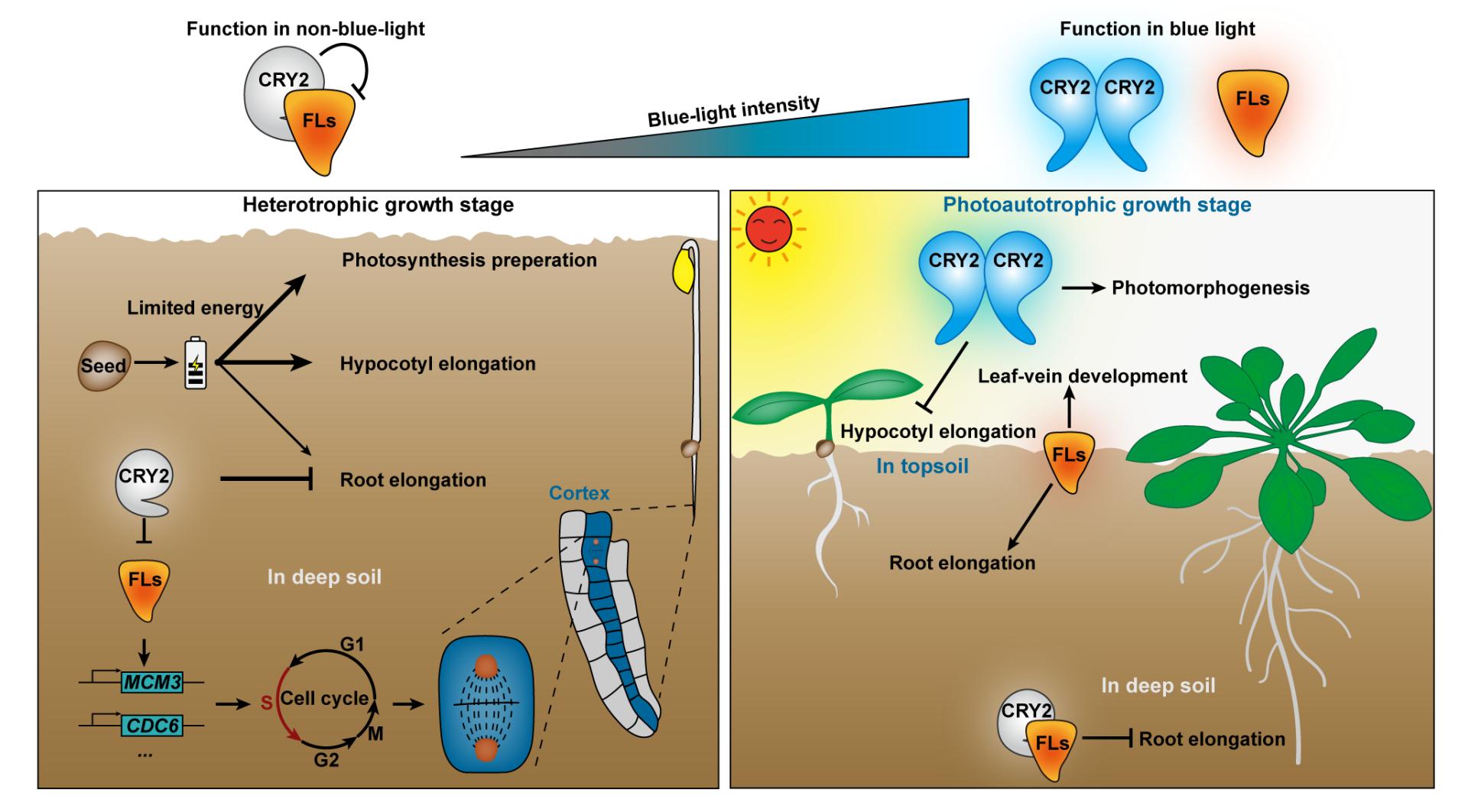 该研究发现拟南芥蓝光受体CRY2在黑暗中居然调控细胞分裂、光合作用等多个重要生命过程相关基因表达。进一步表型观察发现,黑暗条件下,在通常会被忽视的黄化苗根部,CRY2通过抑制根尖分生区细胞分裂从而抑制主根伸长,而蓝光则解除该抑制。通过筛选获得在黑暗(或非蓝光条件)下同CRY2结合的蛋白FORKED1-LIKE(FL)家族成员FL1和FL3,它们和CRY2的结合特异受蓝光抑制。后续研究确认FL只能结合非蓝光激发的CRY2单体而不能结合蓝光激发后的CRY2多聚体。FL1和FL3是两个位于CRY2遗传学下游的促细胞分裂因子,具备结合细胞分裂基因染色质并促进基因表达的功能。黑暗中CRY2通过结合FL从而抑制FL促根尖分生区细胞分裂,进而抑制主根伸长。蓝光下CRY2形成多聚体不再能同FL结合,FL功能被释放从而促进主根伸长。(图1)