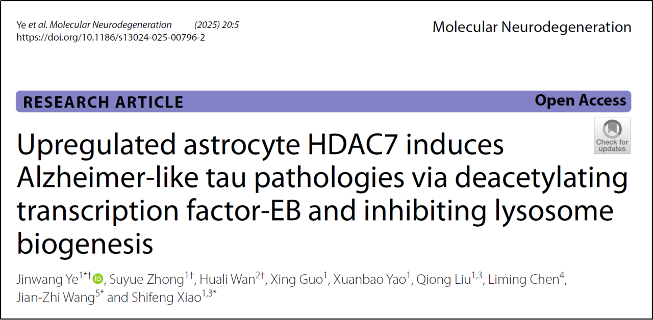 2025年1月13日,深圳大学生命与海洋科学学院倪嘉缵院士课题组叶金旺和肖时锋团队在Molecular Neurodegeneration(中科院一区,影响因子15.1)杂志在线发表题为:Upregulated astrocyte HDAC7 induces Alzheimer-like tau pathologies via deacetylating transcription factor-EB and inhibiting lysosome biogenesis的研究成果,揭示组蛋白去乙酰化酶7(HDAC7)介导阿尔茨海默病的发病新机制。
