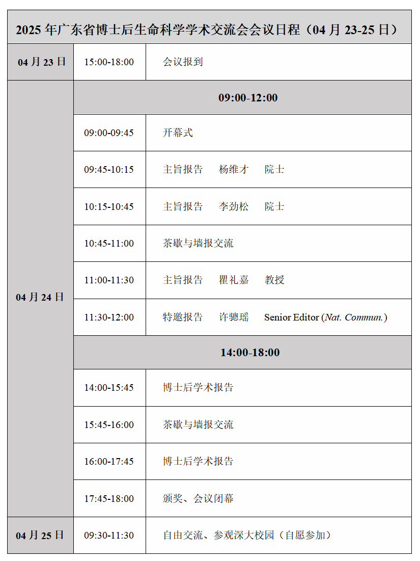 为实施更加积极、开放、有效的人才政策,提高博士后培养质量,搭建博士后交流平台,推动博士后科研成果高效率转化,助力广东打造科技创新新高地,根据《中共中央组织部人力资源社会保障部等7部门关于加强和改进新时代博士后工作的意见》(人社部发〔2022〕91号)、《关于加快新时代博士和博士后人才创新发展的若干意见》(粤组通﹝2017﹞46号)有关精神,拟定于2025年04月23-25日在深圳大学开展广东省博士后学术交流活动系列之生命科学学术论坛。