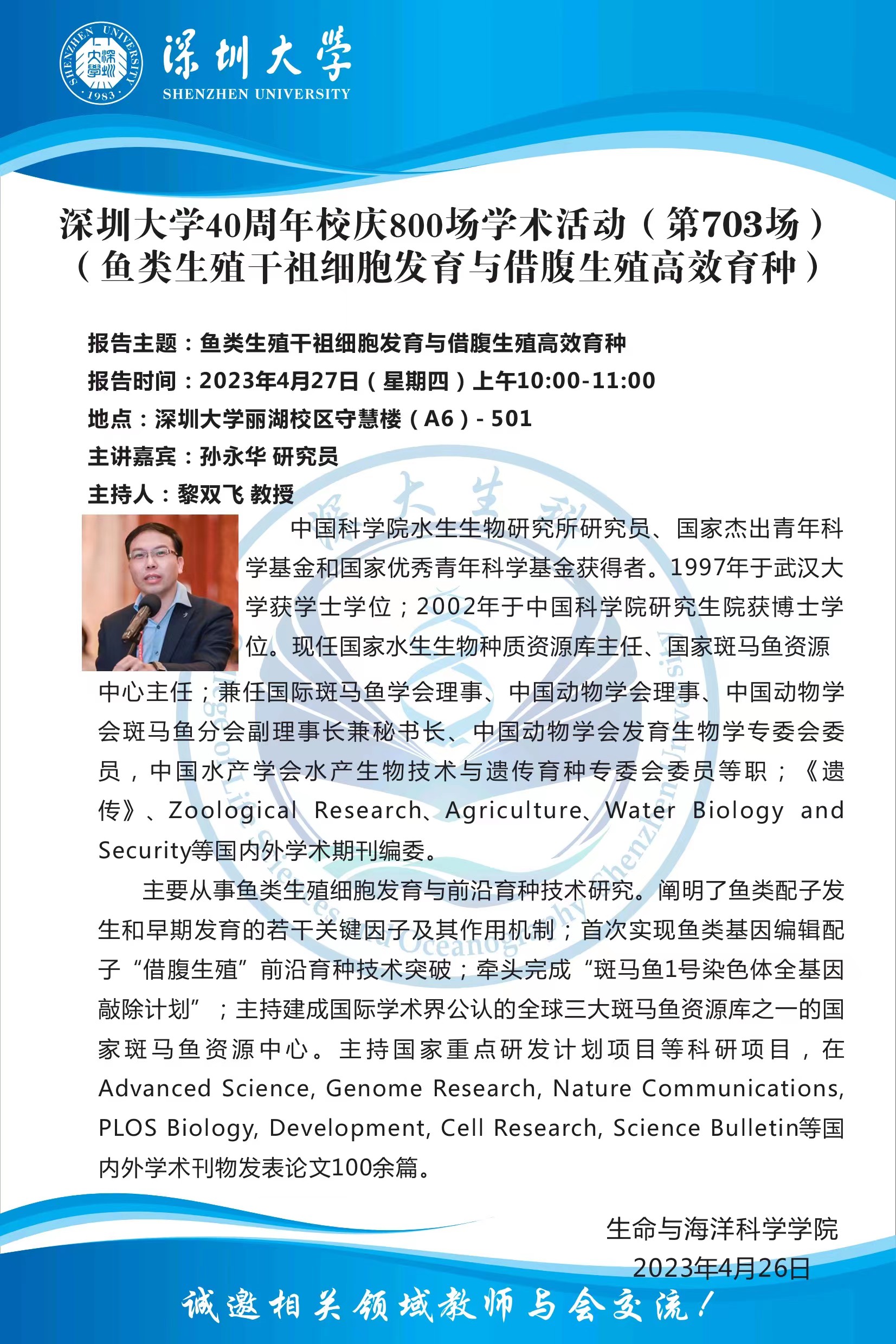 报告主题:鱼类生殖干祖细胞发育与借腹生殖高效育种