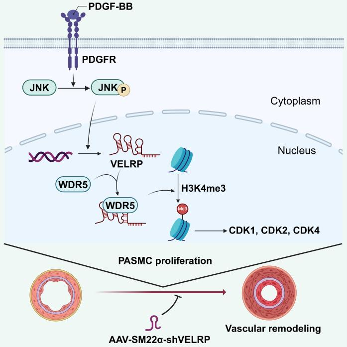综上所述,PDGF-BB通过激活JNK信号通路促进VELRP表达,VELRP通过与WDR5互作,促进CDK1、CDK2和CDK4启动子区域H3K4me3,从而引起CDKs的表达上调,导致PASMC过度增殖,引发肺血管重构及PH。由于PDGF-BB信号在多种心血管疾病中的作用已被广泛研究,VELRP作为其下游调控分子,为临床干预PAH提供了新的潜在靶点和理论支撑,具有重要的研究价值和意义。