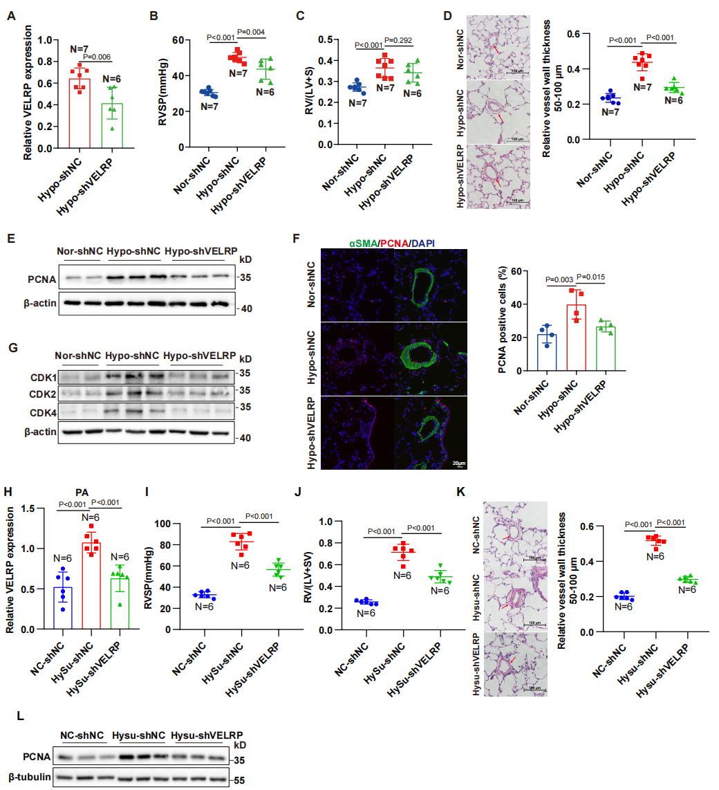 为了探究VELRP在PASMC中的功能,研究者对敲低VELRP的RPASMCs进行转录组测序和GO分析,发现VELRP可能影响PASMC的增殖能力。随后,研究者通过敲低和过表达实验,系统评估了VELRP在PASMCs增殖中的作用。结果表明,VELRP的敲低显著抑制了PDGF-BB诱导的PASMCs增殖,而其过表达则加速了细胞增殖。此外,研究进一步揭示VELRP通过调控CDK1、CDK2和CDK4蛋白的表达影响RPASMC增殖。