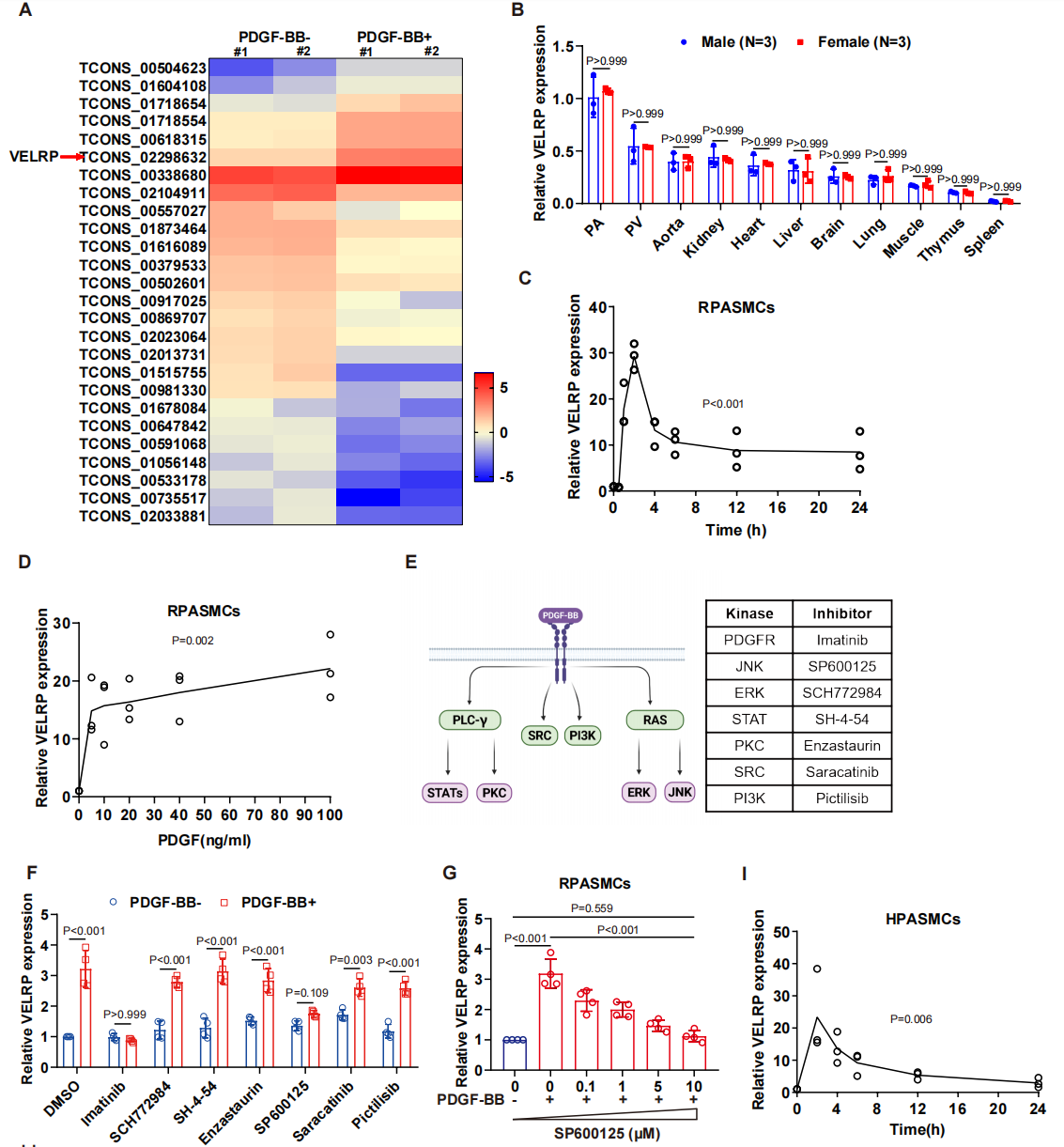 研究者首先通过全转录组测序技术,从PDGF-BB刺激的大鼠肺动脉平滑肌细胞(RPASMC)中筛选并鉴定了一个表达显著上调的新lncRNA。该lncRNA主要在血管组织中高表达,因此命名为 VELRP(Vessel Enriched Long noncoding RNA regulated by PDGF-BB)。此外,VELRP的表达对PDGF-BB刺激的反应呈现时间和剂量依赖性。研究者对PDGF-BB调控VELRP表达的信号通路进行筛选发现,PDGF-BB通过激活JNK/p53通路上调VELRP的表达。