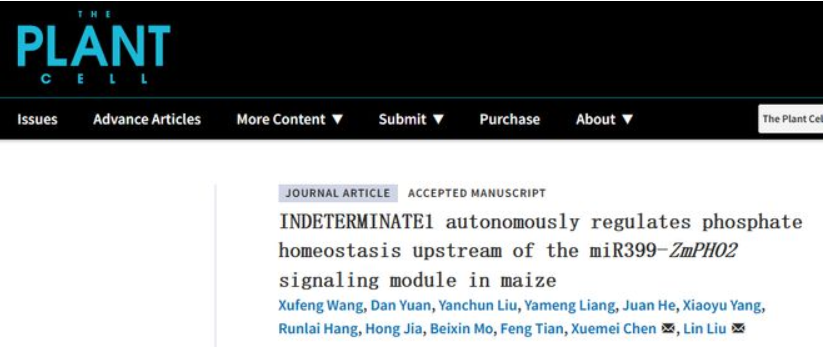 近日,The Plant Cell在线发表了来自深圳大学生命与海洋科学学院刘琳副教授和美国加州大学河滨分校陈雪梅院士团队(现已全职加盟北京大学生命科学院)的题为INDETERMINATE1 autonomously regulates phosphate homeostasis upstream of the miR399-ZmPHO2 signaling module in maize研究论文,揭示了ID1-miR399-ZmPHO2分子模块调控玉米磷稳态的分子机制。
