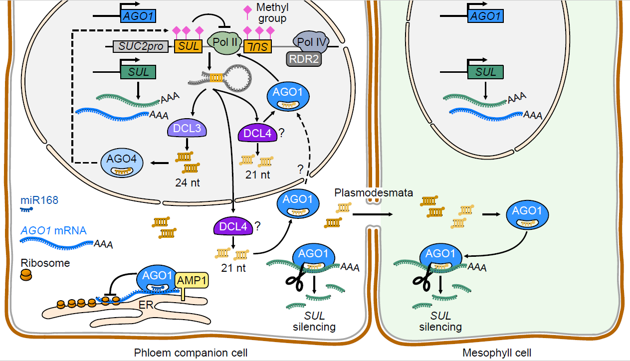 该研究在寻找 AMP1 及其同源物 LIKE-AMP1 (LAMP1) 在 miRNA 介导的翻译抑制之外的作用时发现,在 amp1 lamp1 双突变体中,由反向重复序列引发的沉默作用加剧。作者将 amp1 lamp1 植物与广泛使用的 RNAi 报告系 SUC:SUL (SS) 杂交,其中韧皮部特异性启动子 (SUC) 驱动叶绿素生物合成基因 SULPHUR (SUL;也称为 CHLORINA42) 的人工反向重复序列 (IR) 表达。SS 转录本产生靶向内源性 SUL 的 siRNA,导致明显的叶脉萎黄,这种沉默作用是 ARGONAUTE 1 (AGO1)依赖性的。AMP1 和 LAMP1 通过抑制 AGO1)蛋白水平来抑制 Pol II 依赖的 IR 基因转录进而影响SUL-siRNA的水平。AMP1/LAMP1 缺乏对SUL-siRNA的影响可以通过 AGO1 过表达来重现。研究发现在人工 SS 系统中观察到的 AMP1 LAMP1 突变的影响可以扩展到内源性反向重复序列,例如 IR71 或 At5g22960。该研究揭示了 IR - siRNA 生物合成中两个以前未知的参与者——AGO1(促进 IR 转录)和 AMP1(通过抑制 AGO1 表达间接抑制 IR 转录)。