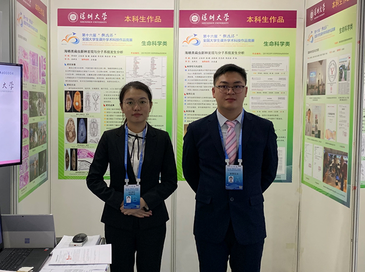 11月12日,由共青团中央、中国科协、教育部、中国社科院、全国学联和北京市政府主办,北京航空航天大学承办的第十六届“挑战杯”全国大学生课外学术科技作品竞赛终审决赛落下帷幕。本次竞赛评审委员会评出特等奖作品35件、一等奖作品105件、二等奖作品286件、三等奖作品786件。其中,深圳大学生命与海洋科学学院李伟轩同学以“海栖类扁虫新种发现与分子系统发生分析”斩获一等奖,该项目同时获得广东省唯一的一个累进创新奖(铜奖)。胡晓舟同学以“单肠目扁虫新种及其系统进化分析”斩获二等奖。