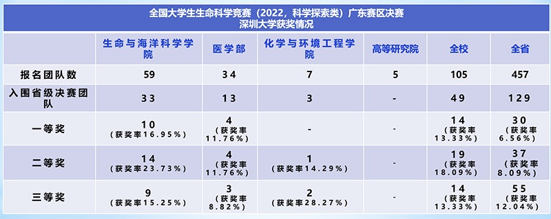 成就梦想,始于足下。自收到本次赛事通知以来,生命与海洋科学学院汪安泰老师作为本次竞赛深圳大学赛事管理员,通过召开竞赛动员会,线上答疑辅导,组织全校报名团队达105项,参赛师生534人,创历史最高。因新冠疫情原因,参赛团队遇到了前所未有的挑战,研究综述、实验设计、竞赛实验、实验记录、数据分析至参赛论文,每一个环节都需要付出百分之百的努力。经过全国双盲评审,深圳大学有49项晋级省级决赛(广东赛区晋级率28%,深圳大学46.67%),为省级决赛获奖奠定了基础。这是智慧与能力的较量,心理素质与毅力的比拼!更是在艰难时刻拿出 “竞赛夺冠,舍我有谁!”的霸气!获奖是团队师生全年艰辛付出的回报,祝贺在此次省级决赛中获奖的师生,希望晋级全国决赛的同学们继续拼搏,未来可期!