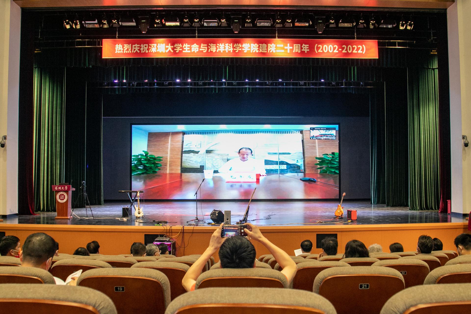 下午3时,庆祝大会拉开序幕。毛军发校长在视频致辞中首先向学院二十年华诞表达最诚挚的祝福,他表示,今年是生命与海洋科学学院建院20周年,也是深圳大学建校39年,深圳大学作为“特区大学、窗口大学、实验大学”,在核心指标和成长数据上高歌猛进,晋升内地发展最快高校之一,跑出了中国特色高等教育改革发展的深大速度,深圳大学已经成为一所特色鲜明、实力雄厚、在国内外具有良好声誉和重要影响力的高水平综合性大学。过去的二十年,生命与海洋科学学院与深圳大学快速发展同行,在办学条件、师资队伍、教学改革、科学研究和人才培养等方面均取得长足发展和进步,培养了近五千名创新创业人才投身于国家建设中,尤其在学科建设、高水平研究论文、国家重点研发项目和学生学科竞赛上均有不俗表现。这些成绩的取得,要感谢学院创办人的无私奉献和全心付出,更要感谢全体师生的辛勤耕耘和刻苦奋斗。他指出,“高校立身之本在于立德树人。只有培养出一流人才的高校,才能够成为世界一流大学。”作为身处改革开放前沿的深大人,面对“双区驱动”“双区叠加”的历史机遇,我们要传承优良的秉性,具备荔园的血性,保持荔园的韧性,贡献于科教兴国、人才强国和创新驱动发展战略,以“国之重器”“国之英才”贡献于“国之大者”。希望学院以20年院庆为起点,以“十四五”规划为契机,在继承中开新局,在创新中谋新篇,为深圳大学加快创建世界一流综合性大学,为建设新时代中国特色社会主义标杆大学做出新的更大贡献。祝愿学院越办越好,再创辉煌!