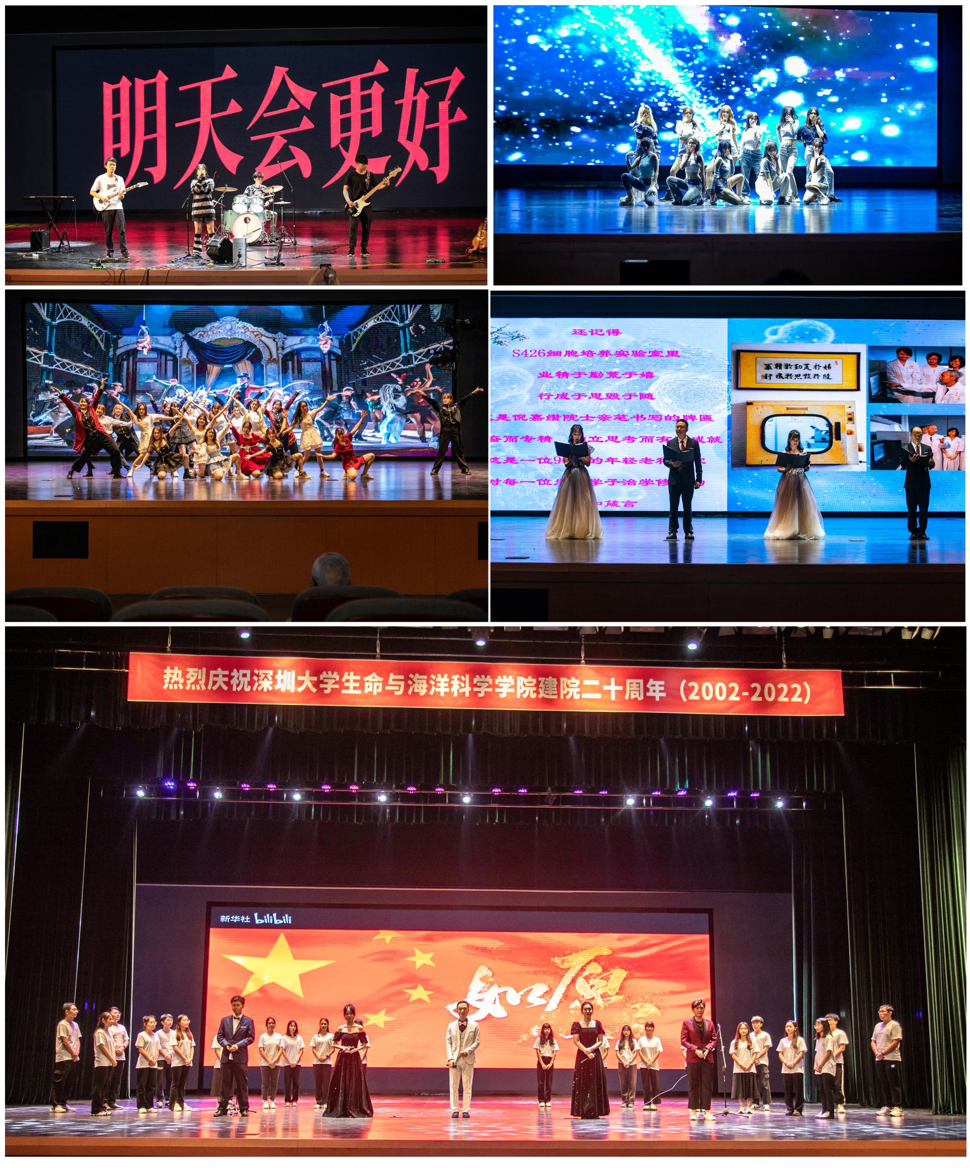 大会播放了院庆主题宣传片《砥砺奋进二十载 同心筑梦启新程》,宣传片以一批批生科人探索、追梦、奉献为主线,从建院之初的筚路蓝缕到飞跃发展,生动诠释了生科人在历史发展中取得的辉煌成就,彰显了生科人以“自立、自律、自强”的校训精神为指引,为立德树人而不懈奋斗的坚实脚步。大会进行了张小云教授珍稀贝壳捐赠仪式、梁俊乾特约教授字画捐赠仪式。大会还颁发了学院20周年院庆特别贡献奖、特别奉献奖、年度贡献奖、征文大赛、摄影大赛和老物件征集等奖项。Bancs乐队带来了《明天会更好》歌曲串烧、ATP舞队带来欢快热情的《Waiting for You》舞蹈,CG舞团带来《The Greatest Show》动感炫舞,学院教师带来感人至深的原创诗朗诵《生命中的那片海》,每个人心中都有一片海,那是岁月的波澜,浪花飞溅,道出了每一个生科人对学院的热爱和感恩。大会最后在合唱节目《如愿》和在场嘉宾、师生的热烈掌声中落下帷幕。