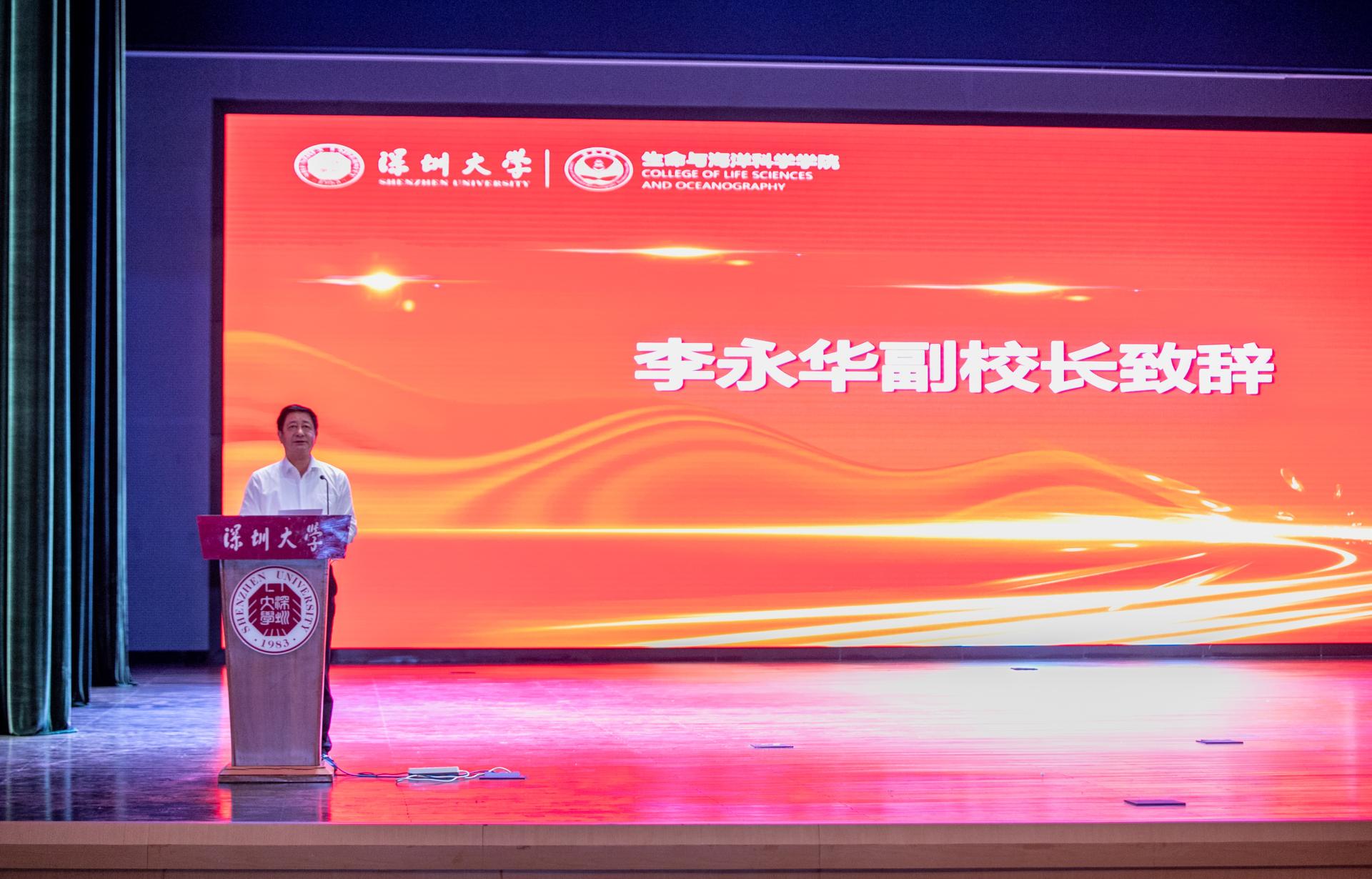 李永华副校长作为联系学院的校领导致辞,他指出,作为深圳高等教育长子的深圳大学,我们在伟人的嘱托中诞生,在特区的发展中成长,与特区同生共长、同频共振,深圳大学已经成为一所特色鲜明、实力雄厚、在国内外具有良好声誉和重要影响力的高水平综合性大学。生命与海洋科学学院自建院以来,坚守初心使命,落实立德树人根本任务,已建成了一个特色鲜明、有一定影响力的教学研究型学院。雄关漫道真如铁,而今迈步从头越,他提出三点期望,一是希望大家牢记初心使命,要深入学习贯彻党的二十大精神,牢记习近平总书记关于教育、科技的重要论述,办好人民满意的教育;二是希望大家铭记“自立、自律、自强”的深大校训,继续保持“荔园的韧性和血性”,共同谱写学院新的未来;三是希望大家不懈奋斗、矢志一流,积极投身粤港澳大湾区和深圳先行示范区建设等国家重大战略需求,为深圳大学加快创建世界一流综合性大学,为建设新时代中国特色社会主义标杆大学团结奋斗。二十载东方风来满眼春,新时代南海潮头又春风,祝愿生命与海洋科学学院的明天更加灿烂辉煌!