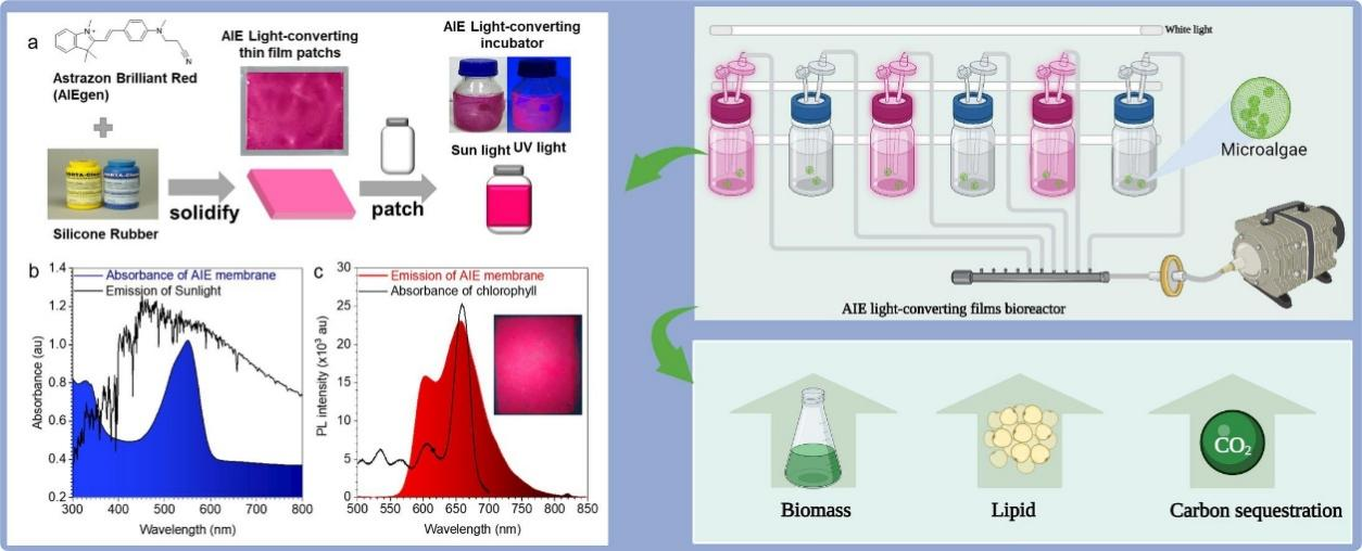 聚集诱导发射(AIE)描述了分子聚集体表现出比单分子更强的发射的光物理现象。该机制被称为分子内运动限制(RIM),即在聚集状态下,由于分子内运动的限制,非辐射衰变通道被阻塞,导致发射增强。因此,AIEgens在聚集状态下具有高发射率,这提供聚集形成或高浓度,具有更高的无限光转换性能和光稳定性。由于能够改善光质量和增强光合作用效率,一些生物成像、图像引导治疗、传感器和智能材料已经基于AIEgens被开发出来。然而,作为一种可持续的光捕获材料,AIE材料在改善光合生物的光环境方面并不常见。