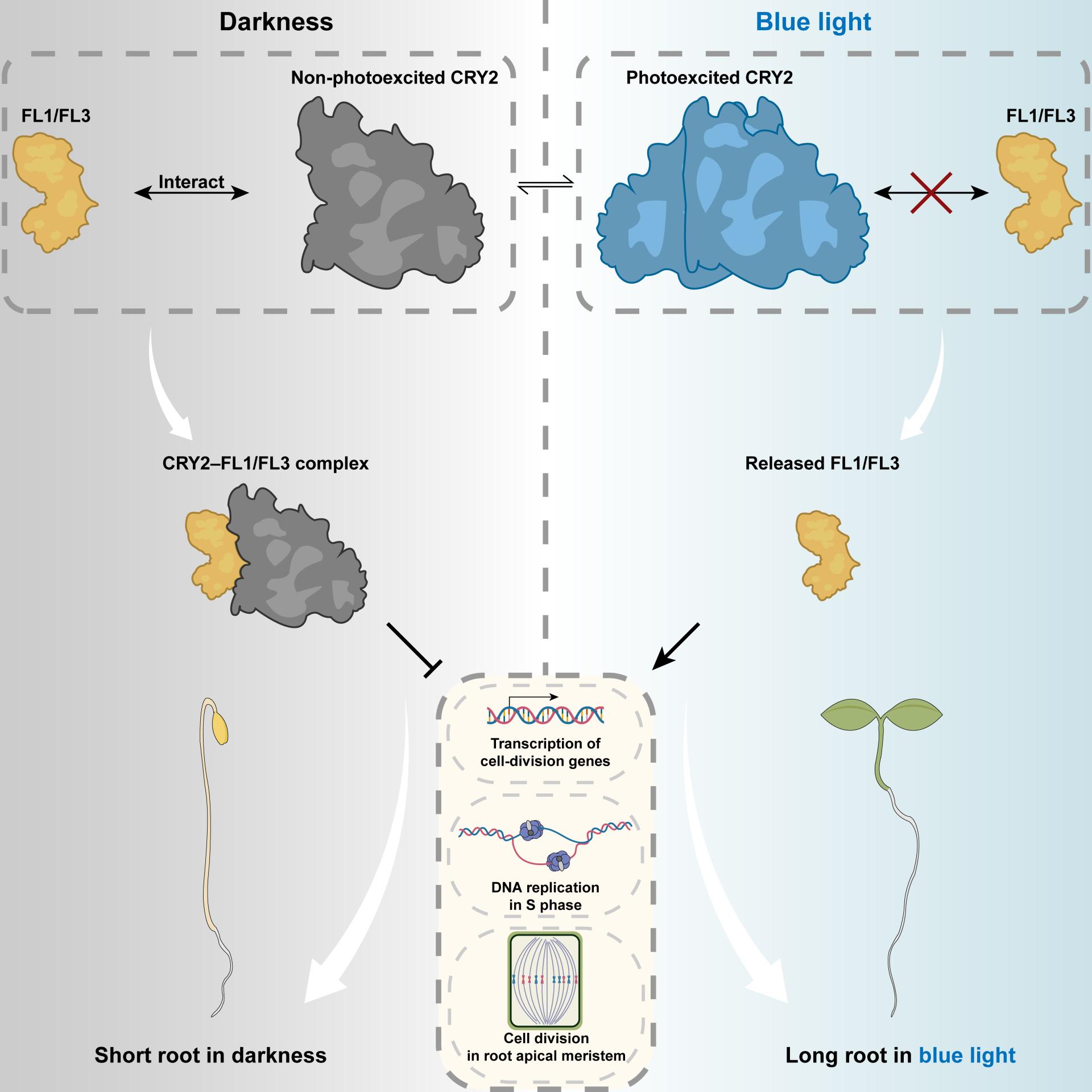 该研究发现拟南芥蓝光受体CRY2在黑暗中居然调控细胞分裂、光合作用等多个重要生命过程相关基因表达。进一步表型观察发现,黑暗条件下,在通常会被忽视的黄化苗根部,CRY2通过抑制根尖分生区细胞分裂从而抑制主根伸长,而蓝光则解除该抑制。通过筛选获得在黑暗(或非蓝光条件)下同CRY2结合的蛋白FORKED1-LIKE(FL)家族成员FL1和FL3,它们和CRY2的结合特异受蓝光抑制。后续研究确认FL只能结合非蓝光激发的CRY2单体而不能结合蓝光激发后的CRY2多聚体。FL1和FL3是两个位于CRY2遗传学下游的促细胞分裂因子,具备结合细胞分裂基因染色质并促进基因表达的功能。黑暗中CRY2通过结合FL从而抑制FL促根尖分生区细胞分裂,进而抑制主根伸长。蓝光下CRY2形成多聚体不再能同FL结合,FL功能被释放从而促进主根伸长。(图1)