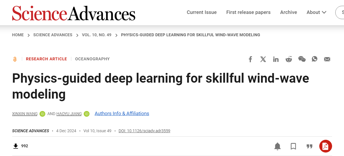 2024年12月,深圳大学生命与海洋科学学院蒋浩宇教授在国际知名期刊《Science Advances》发表题为“Physics-guided deep learning for skillful wind-wave modeling”的研究论文。