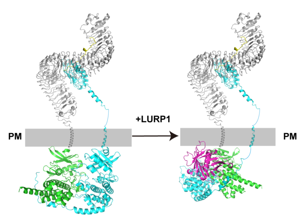 本研究的发现对于理解植物如何在动态环境中有效地平衡光合-防御有着重要的意义。首先,蓝光受体CRY1既能调控气孔打开又能调控气孔关闭,作为一个受体开关,发挥了开和关这两种功效,在不断变换的环境中动态地调整植物生长和免疫状态。其次,本文首次揭示了光信号增强植物PTI免疫的分子机制。在1970年就有文章报道,随着光强的减弱,植物对病原菌的抗性也变弱,但机制一直未知。本研究发现蓝光可以通过受体CRY1介导LURP1对免疫受体FLS2的调控,解析了这种现象背后的分子机制。第三, 本研究首次报道了能够促进FLS2与共受体BAK1结合并促进受体激活的元件LURP1,对更好地理解免疫受体激活过程有着重要意义(图2)。