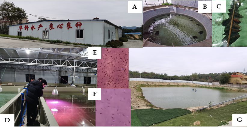 图1 广州华轩水产的加州鲈育苗养殖基地。(A)育种车间外观;(B)亲鱼池;(C)卵片;(D)标粗池;(E-F)鱼苗;(G)室外养殖大塘。