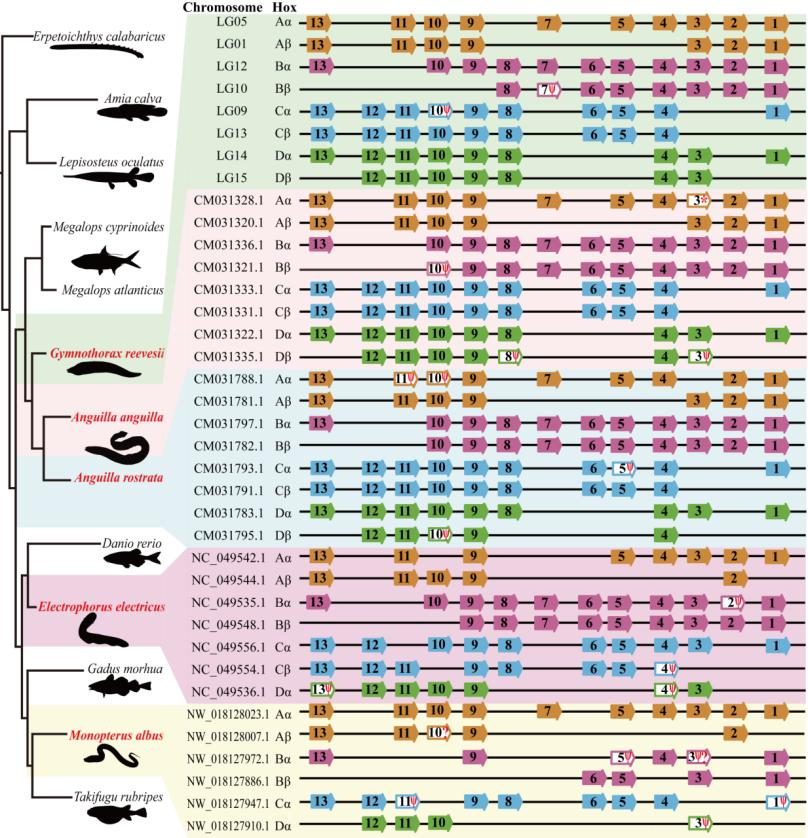 Hox和tbx两个基因家族与鱼类鳍条发育密切相关。分析发现,海水鳗(无胸鳍)基因组中某些Hox基因(如HoxB9β和HoxD13)发生丢失,并且特定tbx基因(tbx5)出现变异 (图4),这些可能是鳗鲡目鱼类胸鳍退化的关键因素。