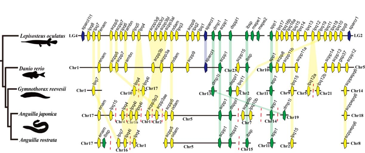 鳗鲡目鱼类在进化过程中,体表无鳞或有极少且退化的鳞片。鳗鲡目和其它具有正常鳞片的硬骨鱼类之间,存在某些参与鳞片形成的基因差异。其中,SCPP基因家族编码一系列富含P/Q的分泌型钙结合磷蛋白,参与骨骼矿化以及牙齿和鳞片形成。研究结果表明,鳗鲡目鱼类的SCPP基因数目明显较少(图5),推测某些特定SCPP基因的缺失可能与鳗鲡目鱼类鳞片极度减少现象相关。总之,本研究为鳗鲡目鱼类染色体核型及体型进化的分子机制提供了新见解。