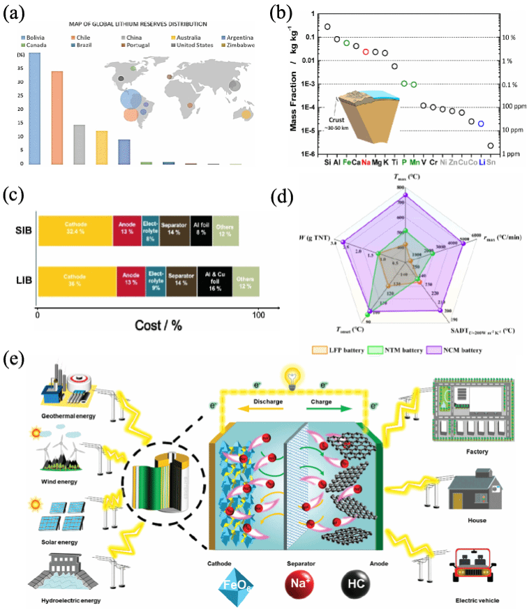 图1. (a) 锂资源分布;(b) 钠资源丰富性对比;(c) 钠离子电池成本优势;(d) 钠离子与锂离子电池热安全性对比;(e) 钠离子电池在电网储能中的应用示意图
