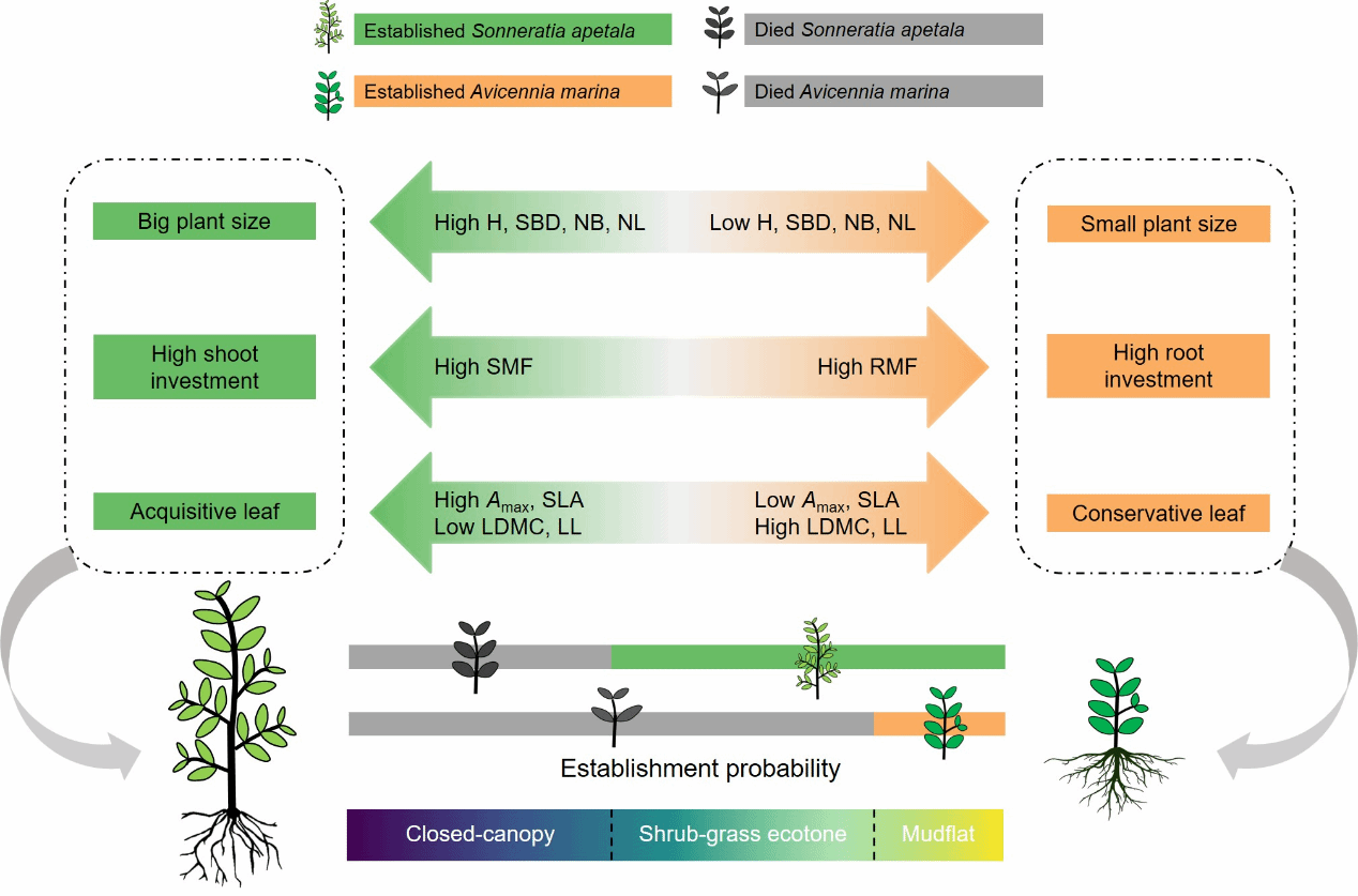 基于功能性状的方法,我们结合野外移植和温室遮光模拟实验,对比分析了入侵种无瓣海桑与本土种白骨壤(Avicennia marina)的性状-环境互作关系。(3)无瓣海桑的性状综合征—快速生长能力、获取型叶性状(光合速率高、比叶面积大、叶片寿命短)以及偏向地上部分(茎干)的生物量分配策略,该性状综合征将光可利用性与幼苗建植过程紧密关联;与此相反,白骨壤的保守型叶性状(叶干物质含量高、叶片寿命长)及偏向地下部分(根系)的生物量分配策略,则使其生长与建植过程解耦(图3)。