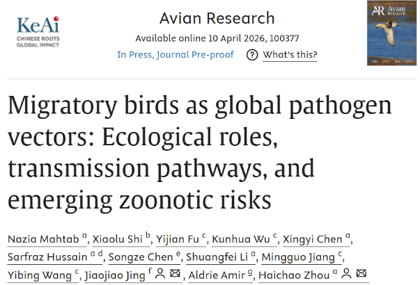 2026年4月10日,深圳大学生命与海洋科学学院周海超课题组协同国内外的疾控、医疗、高校和科研等多家机构,在国际知名鸟类学期刊《Avian Research》发表了题为“Migratory birds as global pathogen vectors: Ecological roles, transmission pathways, and emerging zoonotic risks”的系统综述论文。该研究全面评估了迁徙鸟类在全球病原体跨区域传播中的生态角色,解析了环境驱动因子对疾病流行动力学的影响,并提出了基于“全健康”(One Health)理念的防控框架(图1)。
