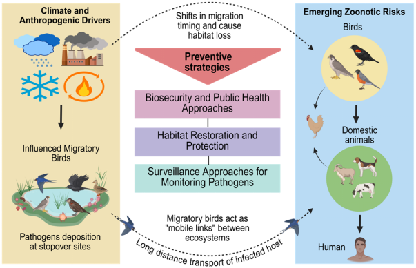 鸟类迁徙是自然界最宏大的生态现象之一,迁徙候鸟通过连接不同大洲的生态走廊(如东亚-澳大利西亚迁飞区,EAAF),在能量流动和营养循环中发挥着核心作用。然而,迁徙行为也使鸟类成为多种传染性病原体(包括病毒、细菌、媒介生物病原体和真菌)的远程携带者和媒介。随着全球气候变化及土地利用方式的改变,鸟类迁徙路径与城市化区域的重叠日益增加,显著提升了新发人畜共患病的爆发风险。