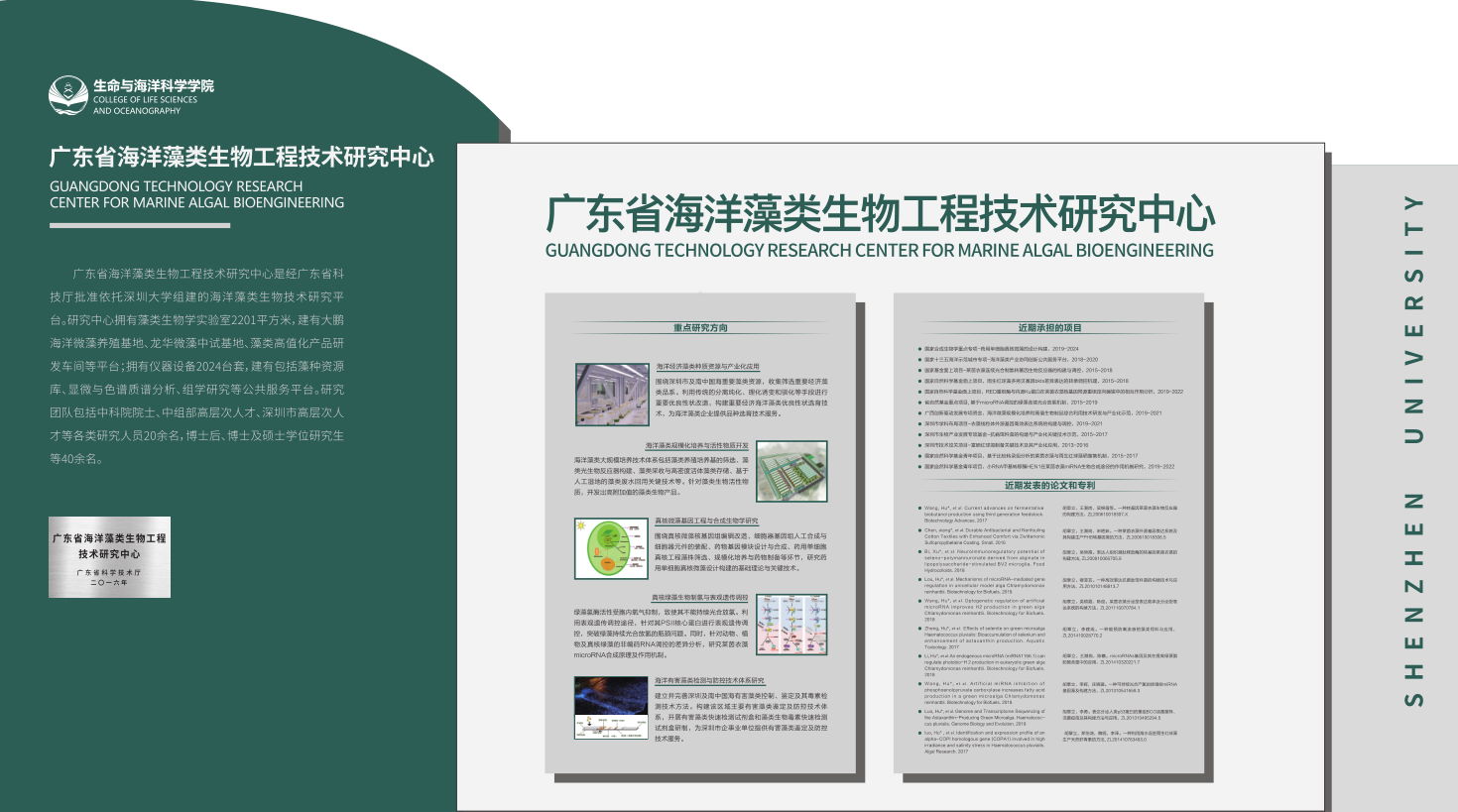 广东省海洋藻类生物工程技术研究中心是经广东省科技厅批准依托于深圳大学组建的海洋藻类生物技术研究平台。研究中心拥有藻类生物实验室2201平方米,建有大鹏海洋微藻养殖基地、龙华微藻中试基地、藻类高值化产品研发间等平台;拥有仪器设备2024台套,建有包括藻种资源库、显微与色谱质谱分析、组学研究等公共服务平台。