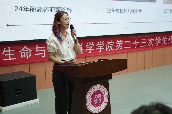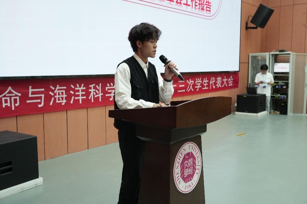 紧接着,生命与海洋科学学院第二十二届学生会主席团成员钟子成同学对上一届工作进行了总结汇报,介绍了过往一年学生会各部门的工作情况,他深信,只要学生会始终秉承 “用心服务,共同成长” 的工作宗旨,持续砥砺奋进,一定可以让学生会成为同学们成长道路上的坚实后盾和温暖家园。各位代表审议并通过了生命与海洋科学学院第二十二届学生会工作报告。