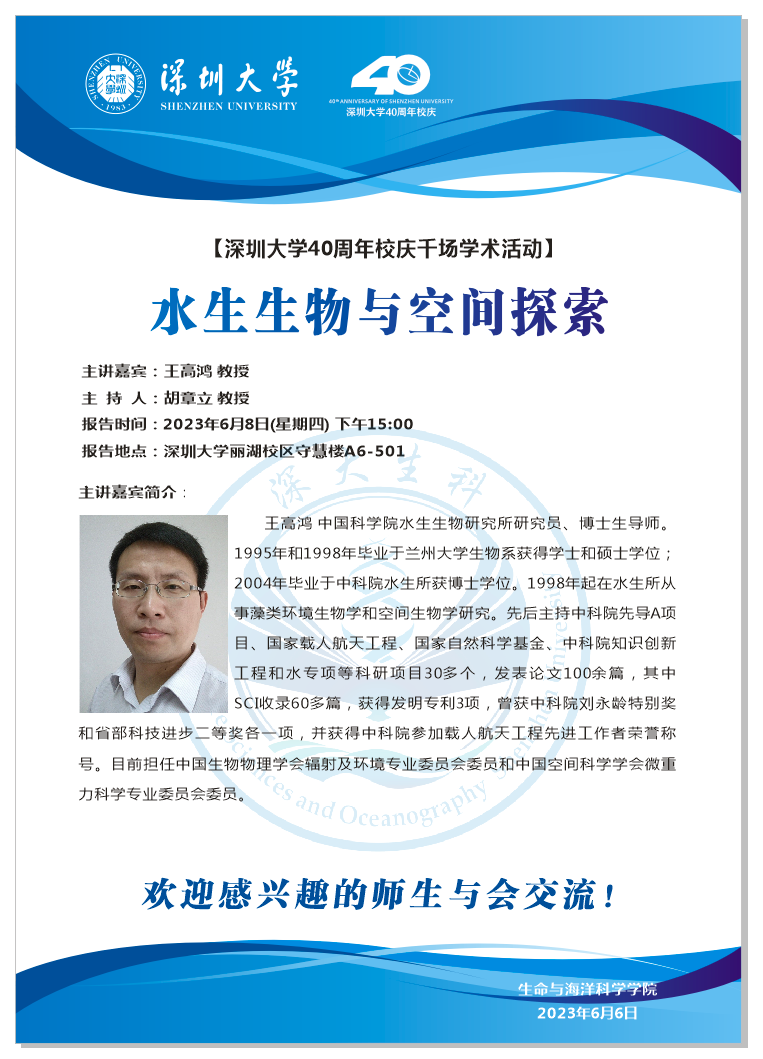 报告主题:水生生物与空间探索报告时间:2023年6月8日(星期四) 下午15:00地点:深圳大学丽湖校区守慧楼A6-501会议室主讲嘉宾:王高鸿 教授主持人:胡章立 教