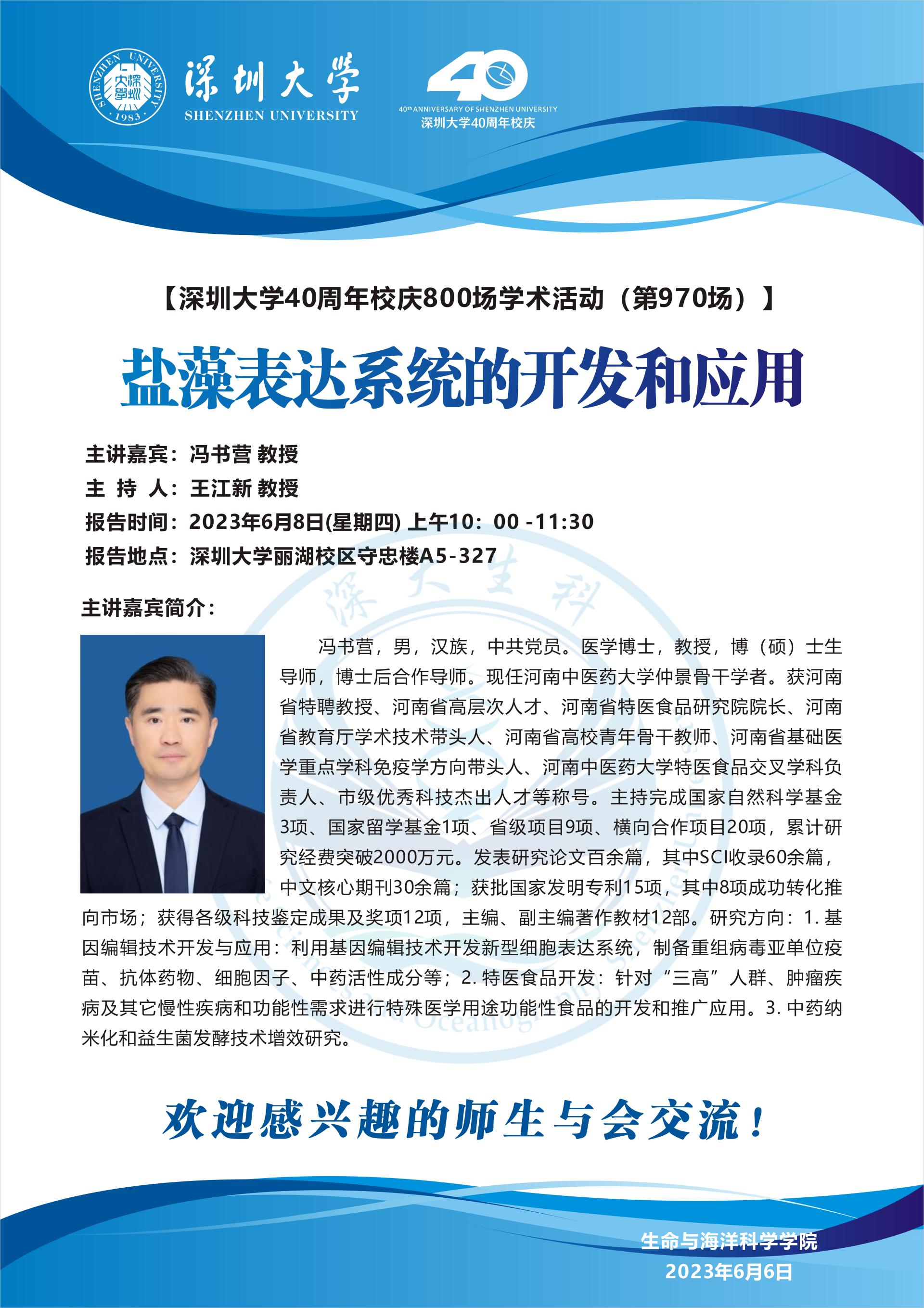 报告主题:盐藻表达系统的开发和应用报告时间:2023年6月8日(星期四) 上午10:00 -11:30地点:深圳大学丽湖校区守忠楼A5-327主讲嘉宾:冯书营 教授主持人:王江新 教