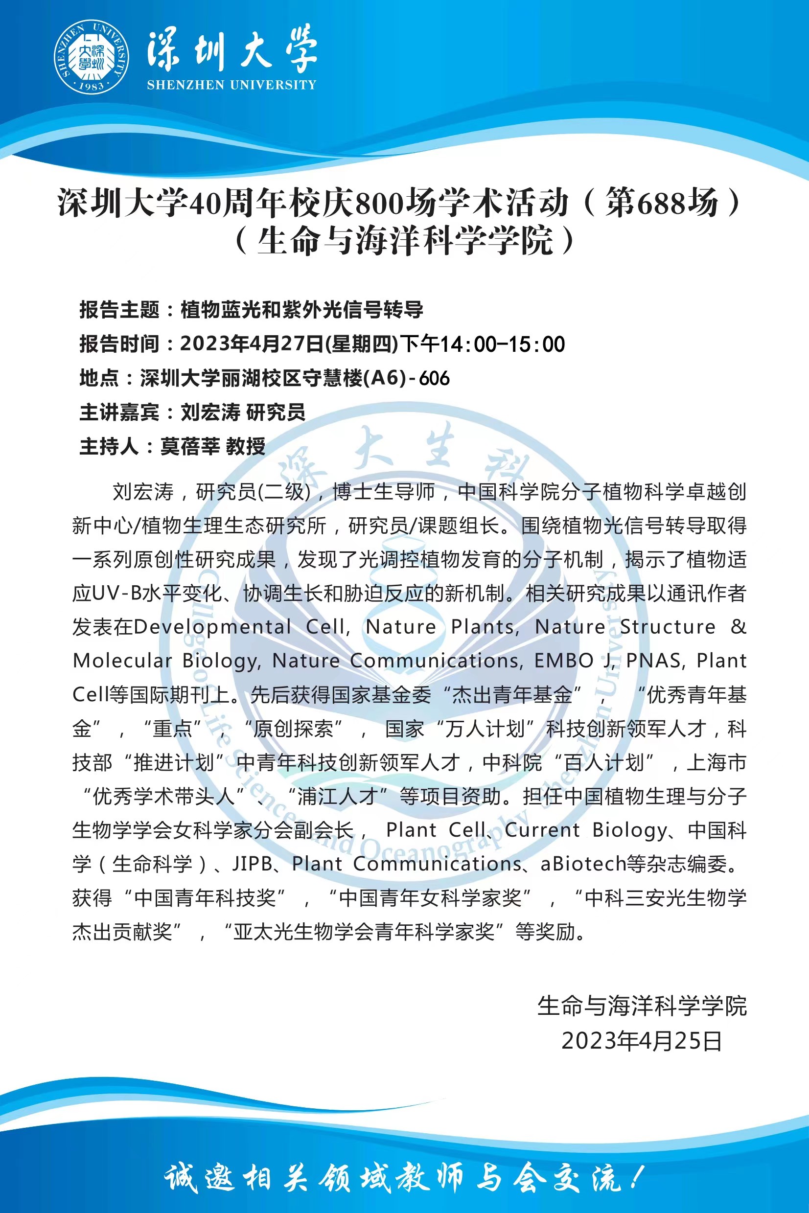 报告主题:植物蓝光和紫外光信号转导报告时间:2023年4月27日(星期四) 下午14:00 -15:00地点:深圳大学丽湖校区守慧楼(A6)-606主讲嘉宾:刘宏涛 研究员主持人:莫蓓莘 教授刘宏涛,研究员(二级),博士生导师,中国科学院分子植物科学卓越创新中心/植物生理生态研究所,研究员/课题组长。围绕植物光信号转导取得一系列原创性研究成果,发现了光调控植物发育的分子机制,揭示了植物适应UV-B水平变化、协调生长和胁迫反应的新机...